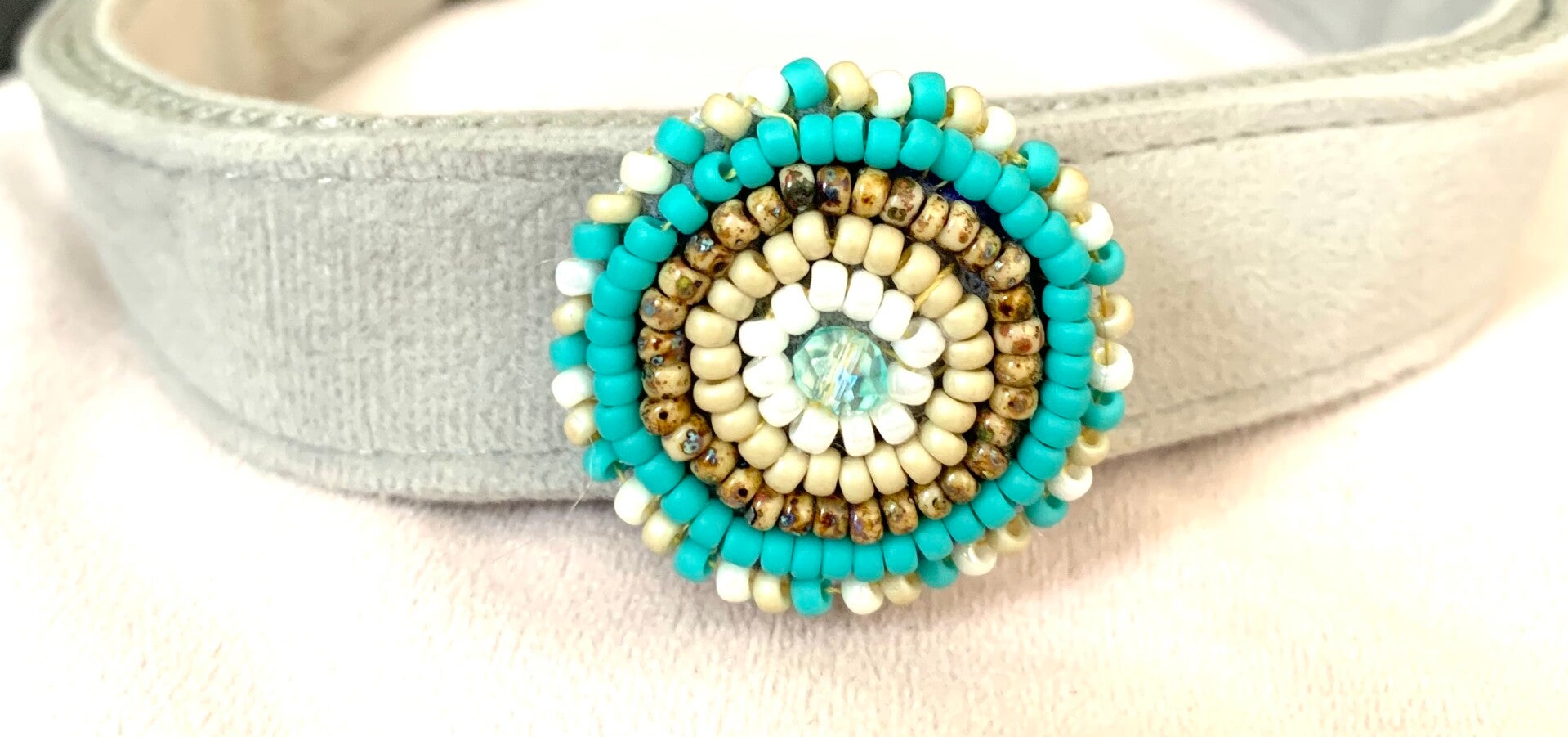 De Ocean &zand charm is met de hand geborduurd met fijne Miyuki kraaltjes in warme tinten turquoise en zand, goud en beige, met een subtiele rode steen in het midden.